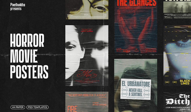 Every layout drips with cinematic dread — lurking shadows, vintage serif titles, or an awkwardly still forest shot you know will end in screams. You get 300 dpi CMYK files , neatly layered and ready for cult classics, student films, or compelling fake trailers. Not to mention stylized posters, merch, streetwear, stickers, book covers, and more.