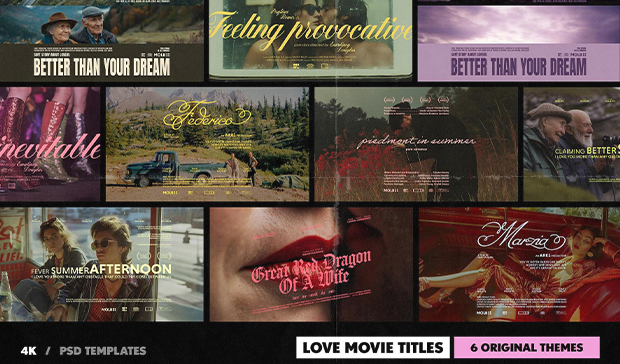Cue the string swell and a kiss framed in 4K — this set of love movie title templates captures romance the way Call Me by Your Name captured sunlight. Inspired by the dreamy stillness of In the Mood for Love or the sharp nostalgia of Blue Valentine , each of the 6 designs plays like a scene from a film you wish you’d made.
