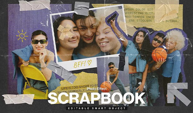 This Scrapbook Photo Effect Template in Photoshop PSD format creates a nostalgic collage mockup with elements like sticky duct tape, torn paper, and retro Polaroid frames.