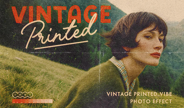 The effect gives photos a vintage-printed finish with warm color shift, heavy grain, and worn paper texture. The scuffed surface and muted contrast are built around a retro mood — as they bring instant nostalgia.